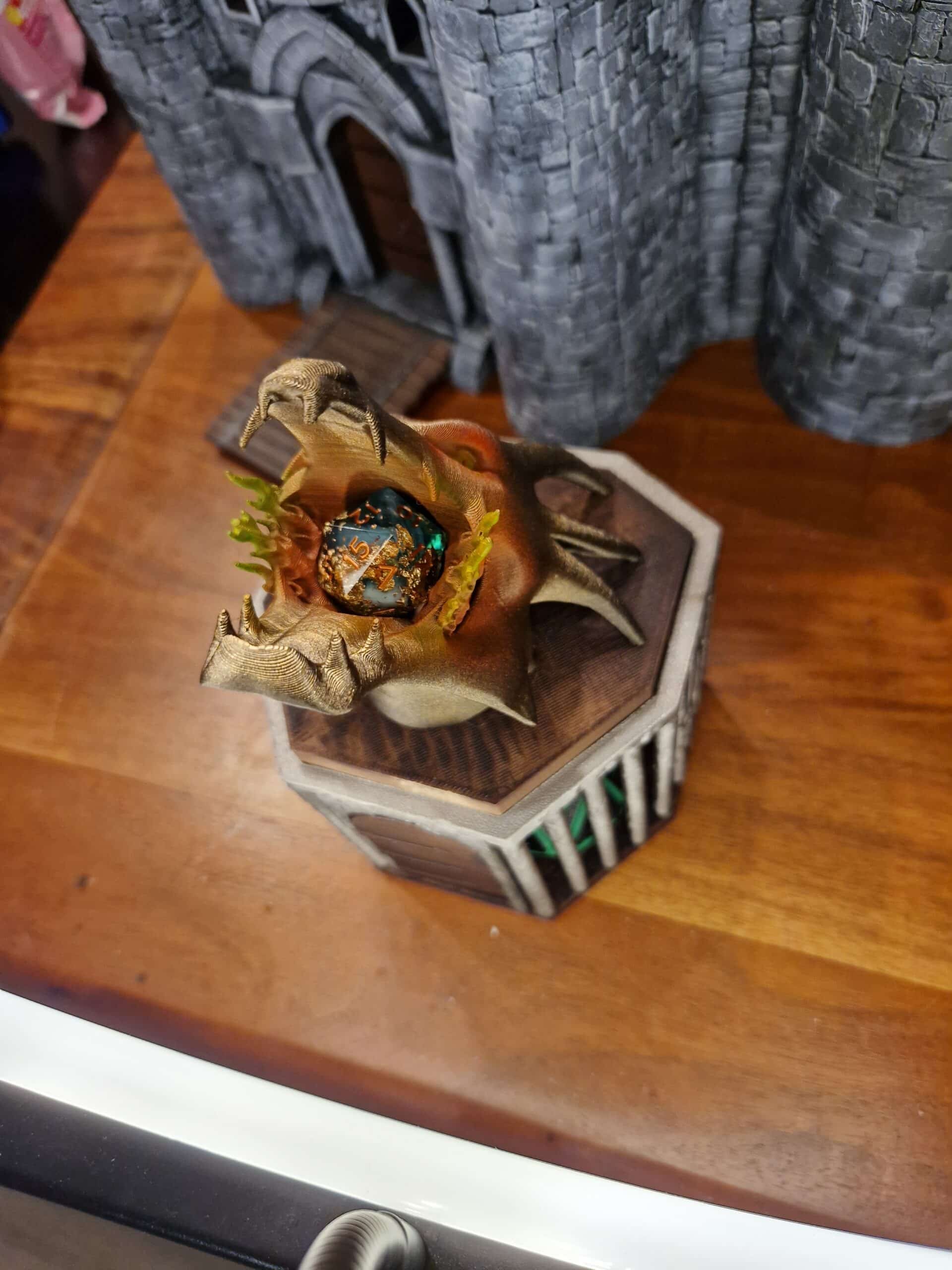 Authentisches Drachendesign: Detailreicher Drachenkopf mit weit aufgerissenem Maul, bereit, ungehorsame Würfel zu verschlingen. Jede Schuppe und jeder Zahn bringt mythische Gerechtigkeit auf deinen Spieltisch.